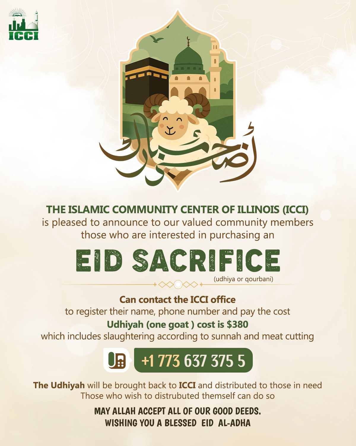 is pleased to announce to our valued community members those who are interested in purchasing an Eid sacrifice (udhiya or qourbani) can contact the ICCI office to register their name, phone number and pay the cost .