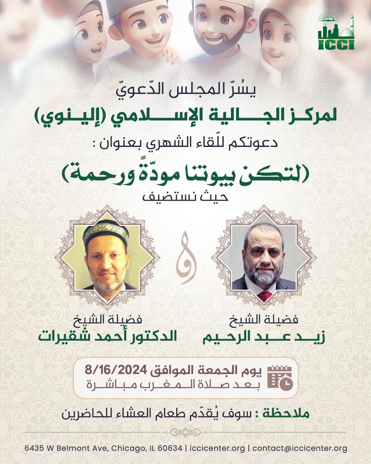 The Da’wah Board at the ICCi is delighted to invite our community to the monthly gathering. “Happy Healthy Homes” Saturday 8/16/24 after Maghreb prayer Dinner will be served